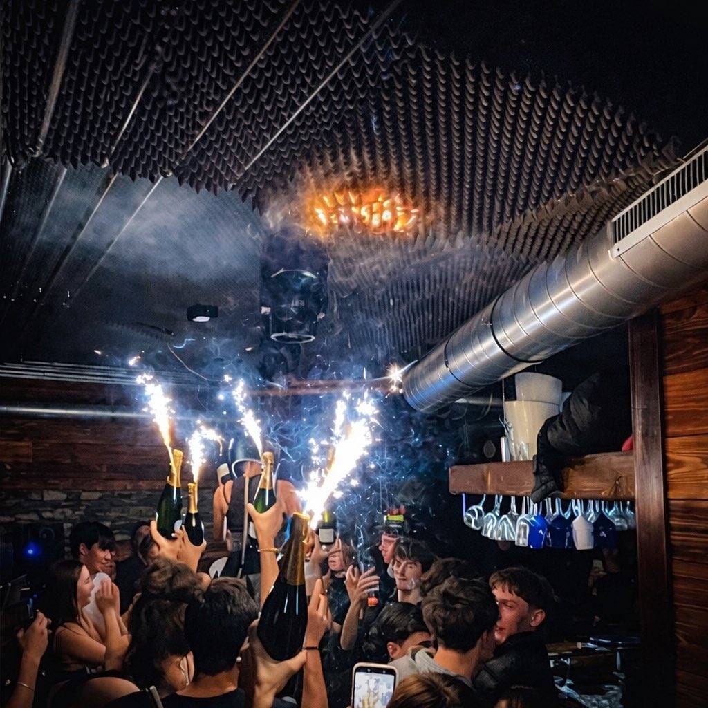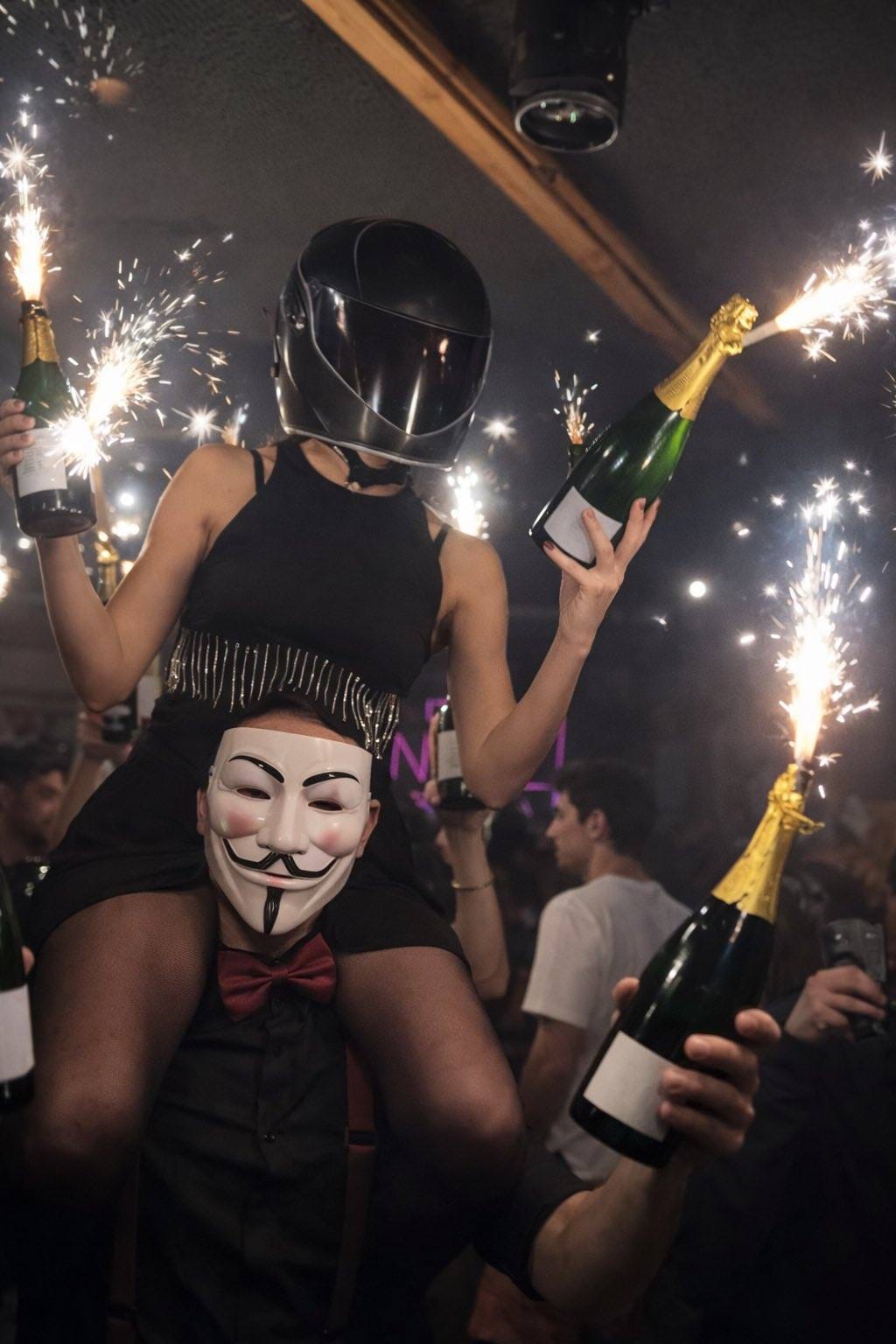 Minuit vient de sonner. La piste est en transe lorsque surgit le rituel le plus attendu de la soirée : une serveuse perchée sur les épaules d’un collègue traverse la foule, brandissant deux bouteilles de champagne surmontées de bougies incandescentes. La jeune femme porte un casque intégral, l’homme un masque de Guy Fawkes [2].