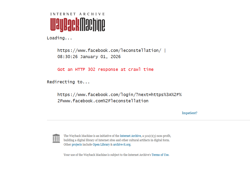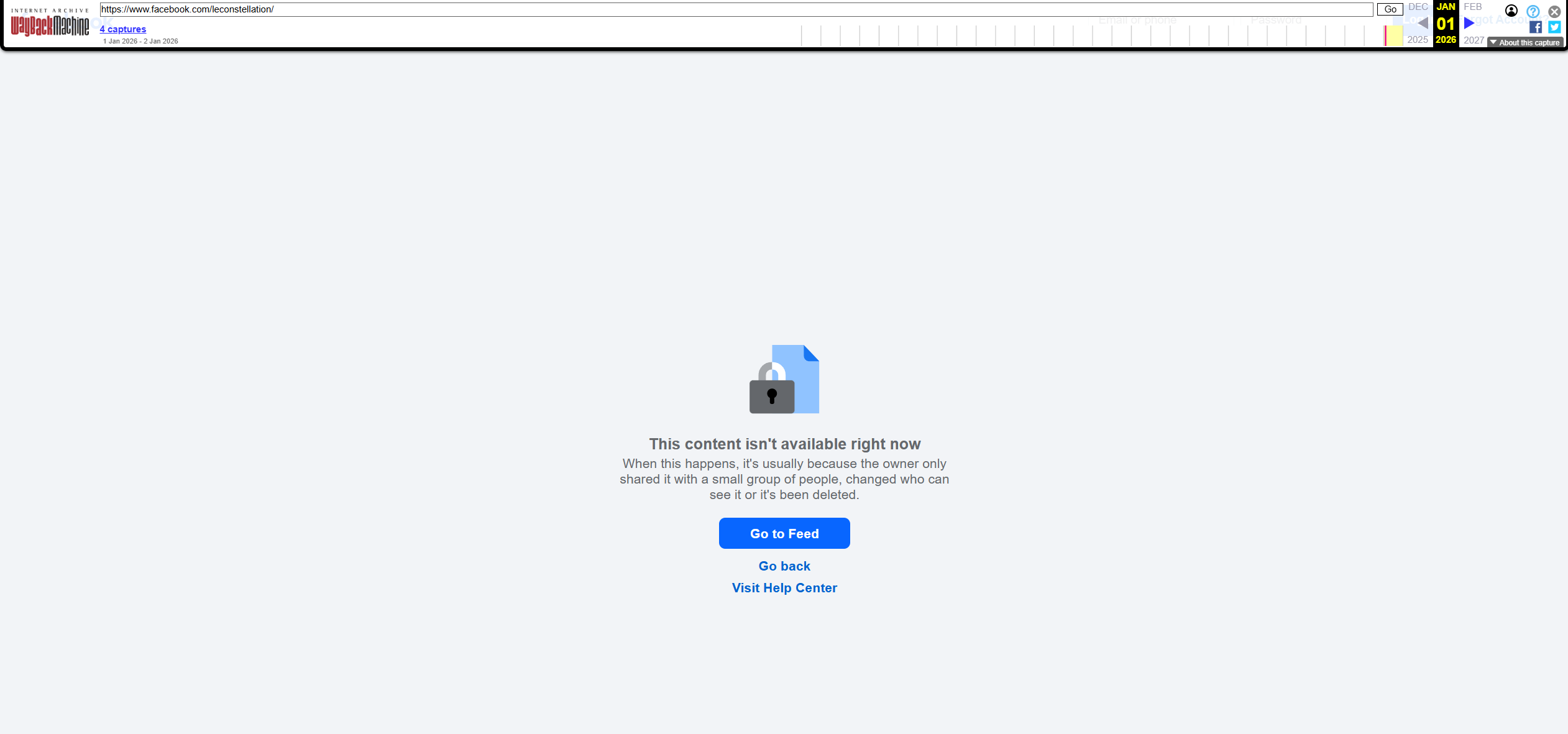 Les archives de la Wayback Machine attestent que la page Facebook du Constellation n’était plus accessible publiquement dès la matinée du 1er janvier, soit quelques heures seulement après l’incendie.