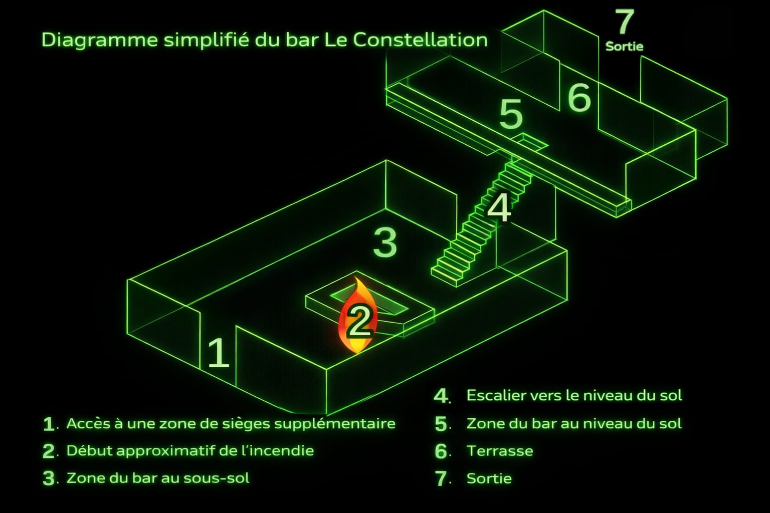 Dans un établissement accueillant jusqu’à 300 personnes, au moins deux issues de secours distinctes, opposées et dégagées auraient dû exister. Au Constellation, elles étaient inexistantes en pratique.