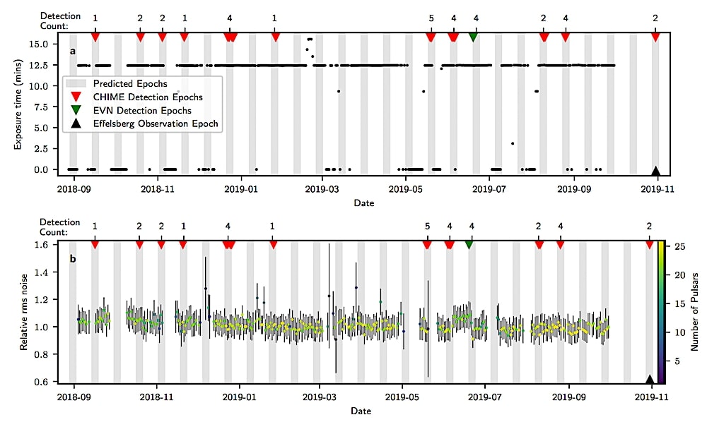 L'équipe CHIME/FRB a surveillé les signaux répétitifs (28 rafales au total) entre septembre 2018 et octobre 2019 en utilisant le radiotélescope CHIME, situé en Colombie britannique. Pendant cette période, les rafales ont été regroupées en une période de quatre jours, puis ont semblé disparaître pendant les 12 jours suivants, pour un cycle total d'environ 16 jours. Certains cycles n'ont pas produit de rafales visibles, mais ceux qui l'ont fait ont tous été synchronisés sur les mêmes intervalles de 16 jours. Selon le document, cela en fait le premier FRB découvert à correspondre à un calendrier précis.