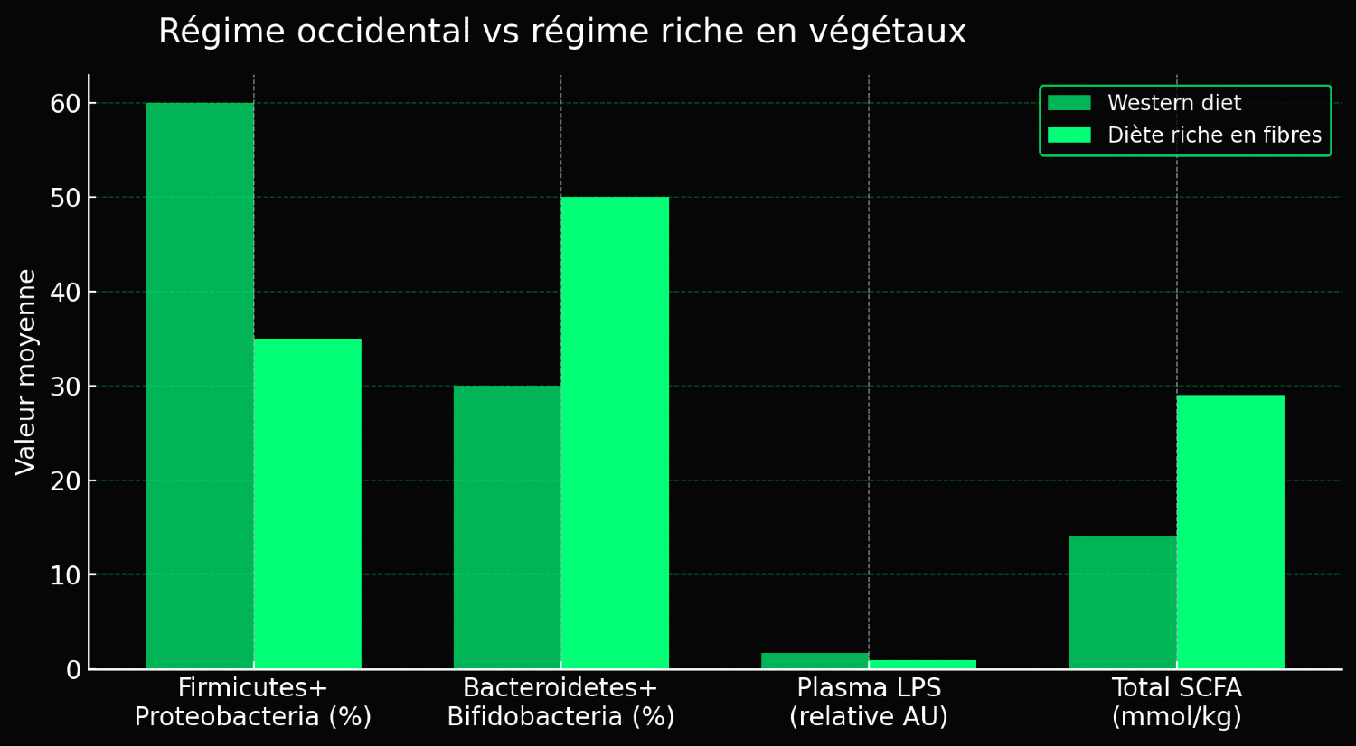 L’une des caractéristiques souvent observées dans un microbiote sain est une grande diversité microbienne. Avoir de nombreuses espèces différentes dans l’intestin semble protecteur, alors qu’une faible diversité est fréquemment associée à l’inflammation et aux maladies. Notamment, des études montrent que plus le microbiote est riche en espèces, plus le profil de santé est favorable (moins d’inflammation de bas grade, meilleur métabolisme). Inversement, le régime alimentaire occidental moderne – riche en graisses saturées, en sucres et pauvre en fibres – tend à appauvrir la diversité du microbiote et à favoriser un état pro-inflammatoire.