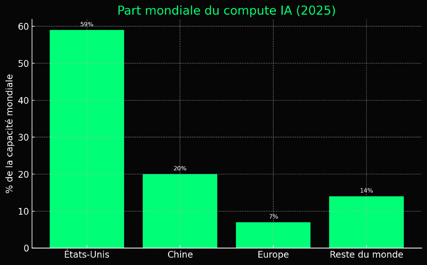 La période 2024-2025 a vu un déploiement fulgurant des modèles d’IA générative à travers le globe, mais de façon très inégale. Les États-Unis dominent clairement le paysage : selon l'IDC, près de 60 % de la puissance de calcul mondiale dédiée à l’IA s’y trouve, concentrée chez les géants du cloud (Microsoft, Google, Amazon) et des semi-conducteurs (Nvidia). La Chine contrôle environ 20 % du compute, grâce à d’énormes investissements dans ses propres puces et centres de données d’IA (Alibaba, Huawei, Baidu). L’Europe, malgré ses supercalculateurs, ne pèse qu’environ 7 % de la capacité – freinée entre autres par sa dépendance aux puces et infrastructures étrangères. Le reste du monde (y compris l’Inde, le Japon, l’Amérique du Sud, l’Afrique…) ne représente qu’une part résiduelle de la puissance d'IA (~14 % cumulé), illustrant une fracture profonde dans l’accès aux ressources. Cette concentration crée un véritable oligopole du cloud et de l'IA : la majorité des grands modèles tournent sur les infrastructures de quelques acteurs (AWS, Azure, Google Cloud) – un atout stratégique de taille pour eux, et un point de dépendance pour les autres nations. Par ailleurs, ces géants disposent de leurs propres modèles d’IA de pointe et nouent déjà des alliances stratégiques solides.