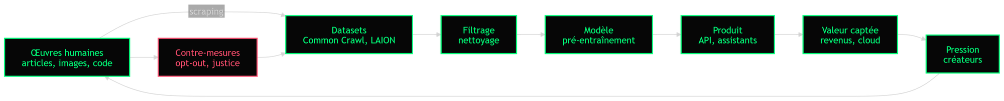 Des articles, des livres, des photos, du code, des forums, des archives, des catalogues culturels... Des milliards de fragments de travail humain aspirés, nettoyés, compressés, puis revendus sous forme de services « intelligents ». [1, 2]