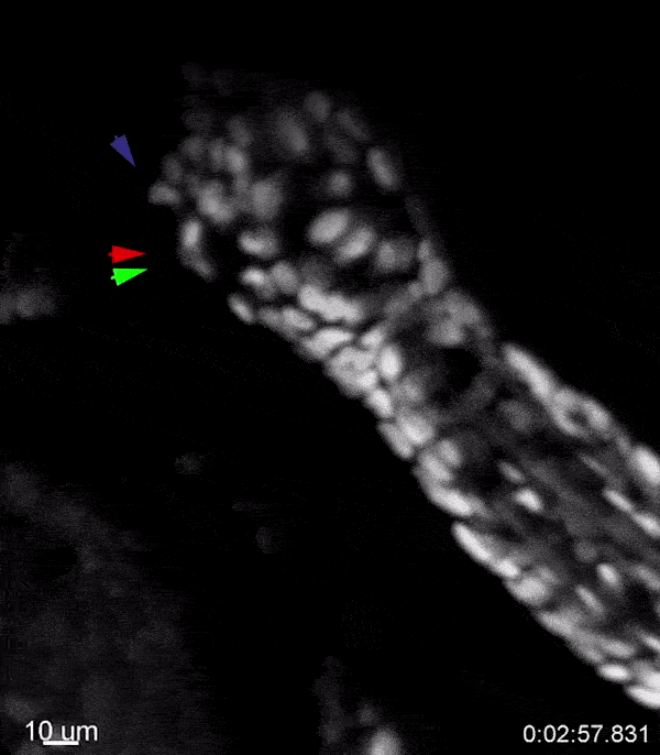 Les chercheurs ont alors observé la croissance de follicules pileux individuels dans les oreilles de souris en utilisant un laser à grande longueur d'onde, capable de pénétrer profondément dans les tissus. Ils ont marqué les follicules pileux avec une protéine fluorescente verte, ont anesthésié les animaux pour qu'ils ne bougent pas, puis ont attentivement observé ce qu'il se passait :
