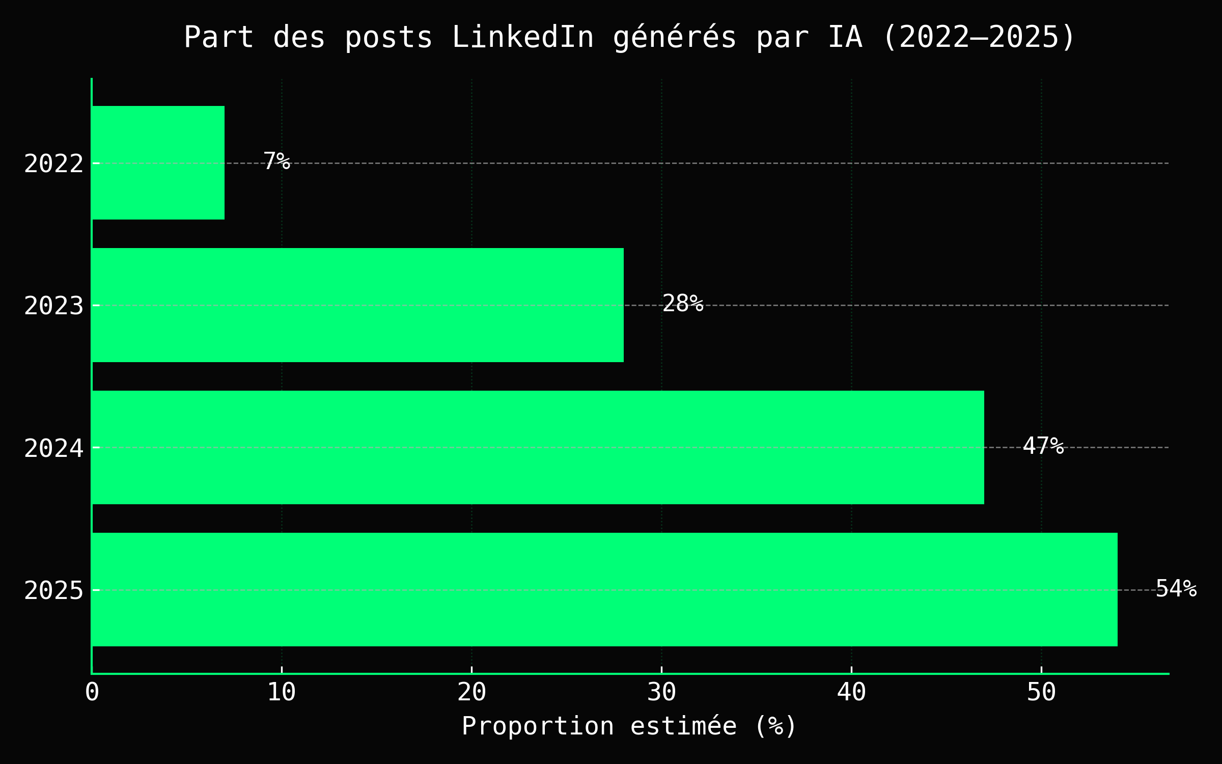 Le résultat ne s’est pas fait attendre : plus de 54% des posts longs en anglais publiés sur LinkedIn sont probablement générés par de l’intelligence artificielle. Autrement dit, plus d’une publication sur deux n’est plus écrite réellement par son auteur humain.