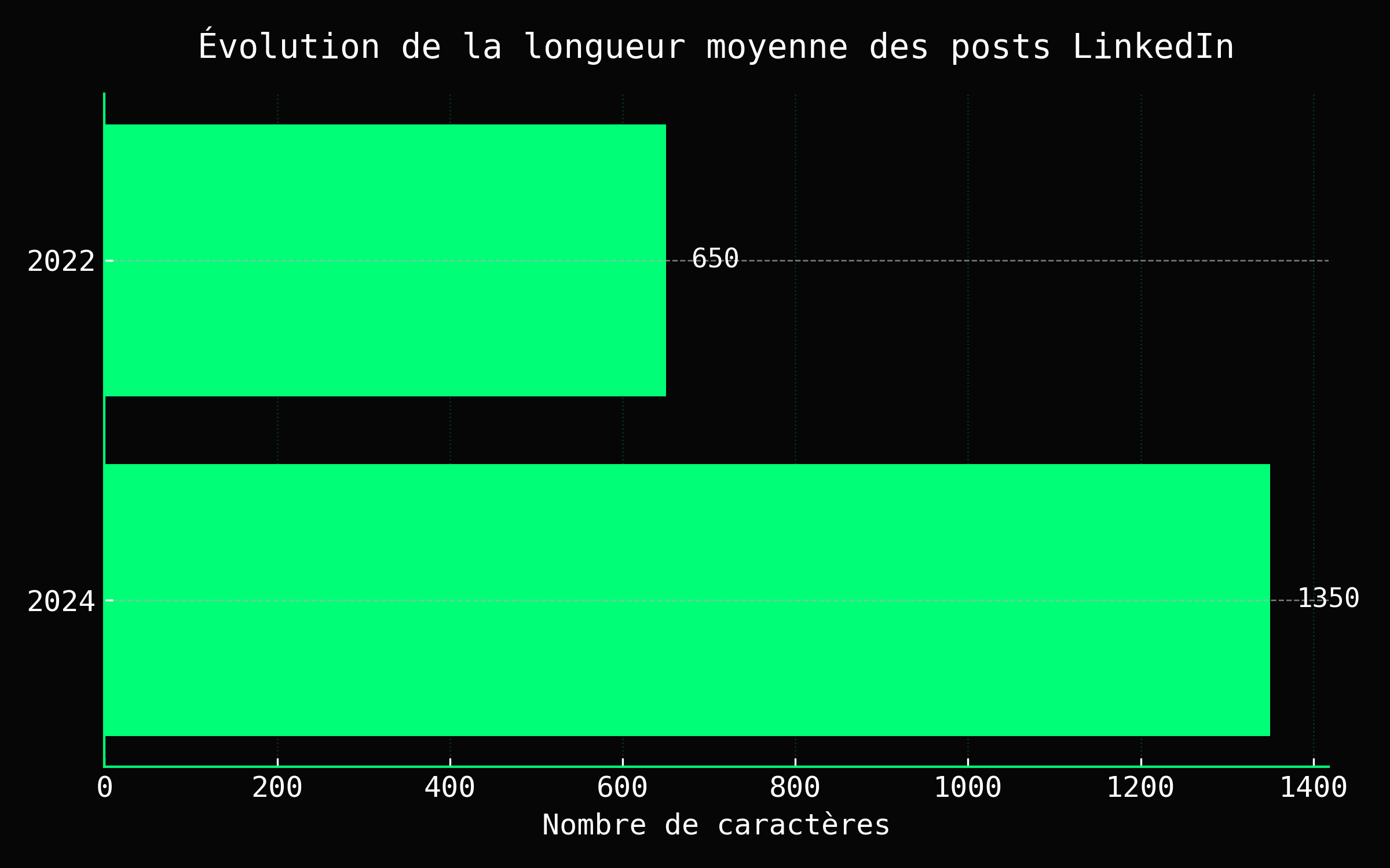 Cette déferlante de textes générés par IA menace directement l’authenticité des échanges professionnels sur la plateforme. Les outils comme ChatGPT facilitent la production de longs blocs de texte bien formatés en quelques secondes, là où un humain aurait mis des dizaines de minutes ou des heures. D’ailleurs, on observe que la longueur moyenne des posts a plus que doublé (+107%) depuis l’arrivée des LLM grand public – signe que beaucoup de gens publient désormais de véritables pavés générés ou étoffés par machine.