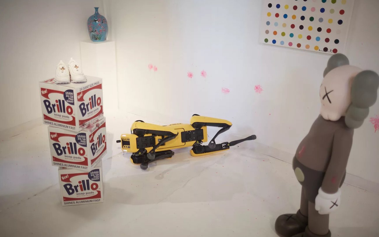 La marque-collectif MSCHF, connue pour être capable de "vendre n’importe quoi en 3 minutes", a récemment dépensé 74'500 dollars pour acheter le célèbre robot-chien Spot de Boston Dynamics. Ils ont eu une idée digne d'un film de science-fiction : monter un fusil (lanceur) de paintball sur son dos et permettre au monde entier de le contrôler à distance via un site web dédié. Pour l'occasion, le chien-robot a été placé dans une galerie d'art, au milieu de certaines de leurs créations.